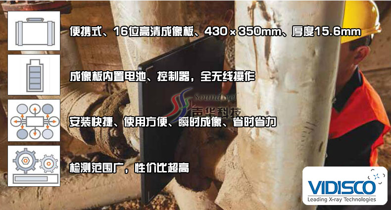 以色列Vidisco公司作为DR检测领域的领导者专注DR的研发与制造20余年,是市场上最高质量的代表,具备数字直接成像系统的设计、制造和检测能力,通过了ISO9001质量认证。产品广泛应用于工业探伤、医疗、安全检查等领域,工业探伤用户涵盖了航空、航天、石化、考古、制造业等等。Vidisco公司的工业DR符合所有的数字射线检测标准,包括焊缝、铸件、腐蚀检测标准,包括金属、非金属、复合材料检测、甚至电缆考古等各种用途,即可便携任意布置,也可以安装在自动或半自动工装上,既可应用于探伤室也可适用于车间现场和外场检测,是市场上唯一高度集成的工程化、系统化设备。