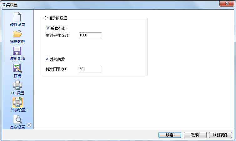 外参触发:“√”选即启用,须与“采集外参”同时使用,由外参输入控制通道波形采集,在“采集设置”>>“波形采样”>>“触发方式”,设置“触发门限”,输入范围是外参量程的5-100%,可直接在文本框中输入5~100(正整数);外参量程是-10V-+10V,采集到有效的外参并且波形高于设置的门限,对应的通道开始采集波形。