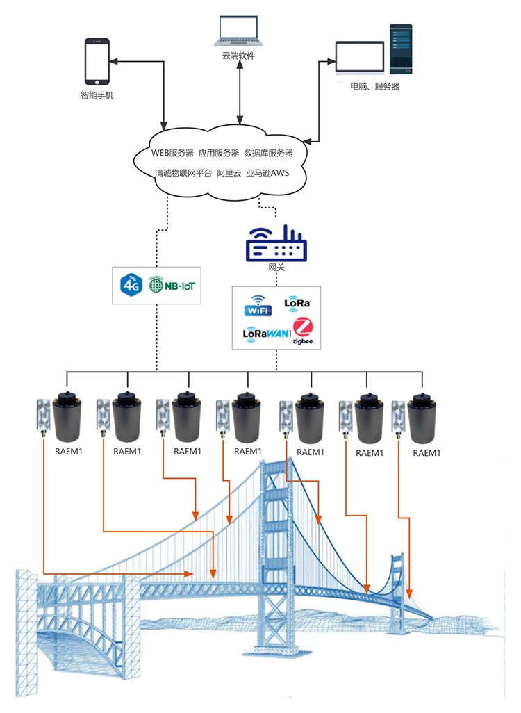 •RAEM1 智能声发射监测系统由RAEM1采集器(传感器 、采集器、信号采集与分析、通讯),平台 (云服务器/局域网 /PC/手机等),客户终端 (手机,PC,大屏等)3个部分组成。(结构模式可选择,传感器、电源均可内置或外置)。