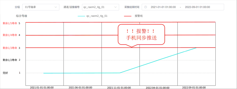据云平台数据可知,1号轴承qc_raem2_4g_01通道在2022-09-01触碰3级报警线,当前轴承存在明显局部损伤,剩余1/3寿命,需要考虑维修(报警推送)。
