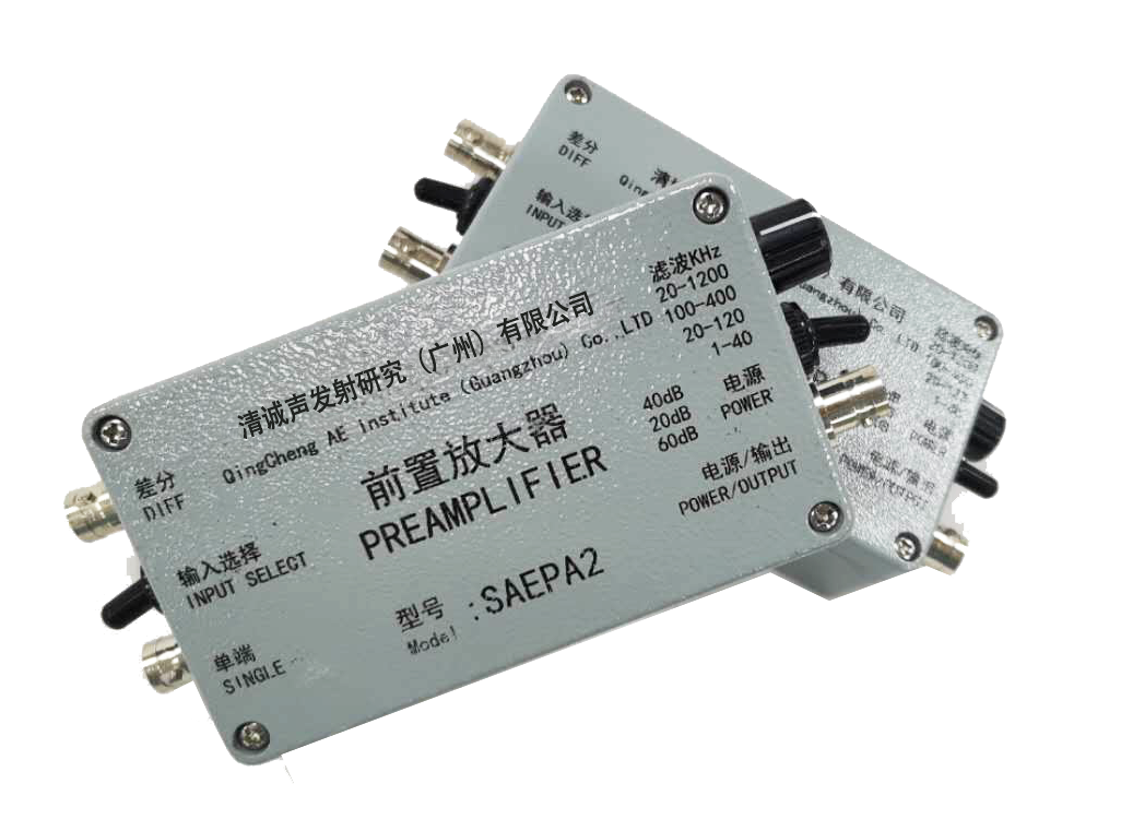 声发射监测中,前置放大器用于放大声发射传感器输出的电压信号。由于声发射传感器的输出阻抗较高,导致输出的电压信号比较微弱,常在微伏级别,经过长距离的电缆传输到达信号采集系统,可能受到传输电缆的噪声及衰减等因素的影响,变得更加微弱,这个时候的信号波形不利于提取和分析,因此,在距离传感器较近的地方(距传感器输出信号线 1~2 米处),利用前置放大器将传感器输出的模拟电压信号放大,以抵抗过长的电缆传输造成的微弱信号泯没于噪声中的问题。前置放大器的放大倍数常用设置为 20dB、40dB 和60dB分别对应放大10倍、100倍和1000 倍,放大倍数的设置通常根据实验情况来确定,本试验采用的北京声华公司的SAEPA2前置放大器其放大倍数可调。