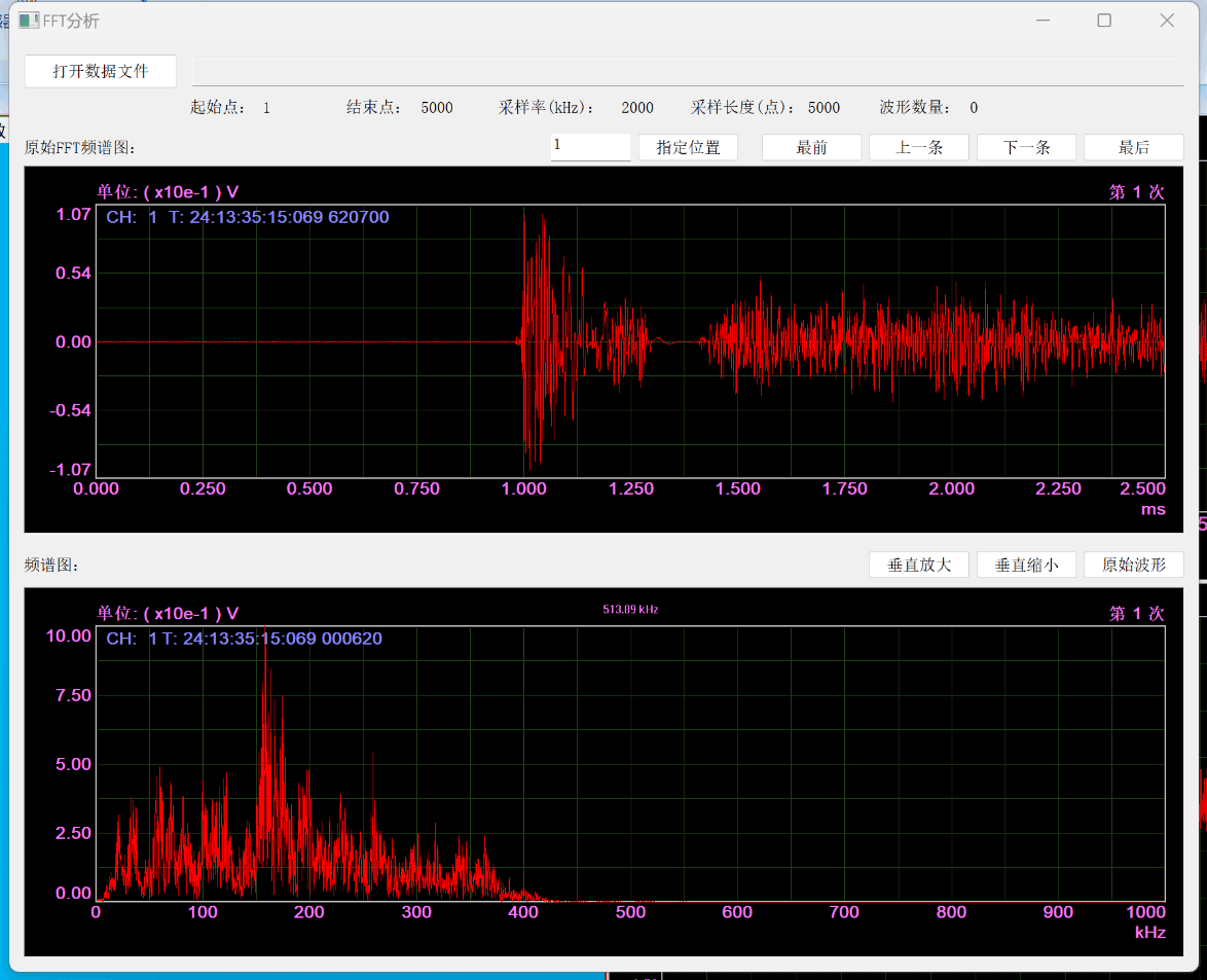图A:铅芯折断信号,采样速度2M,波形和FFT图。
