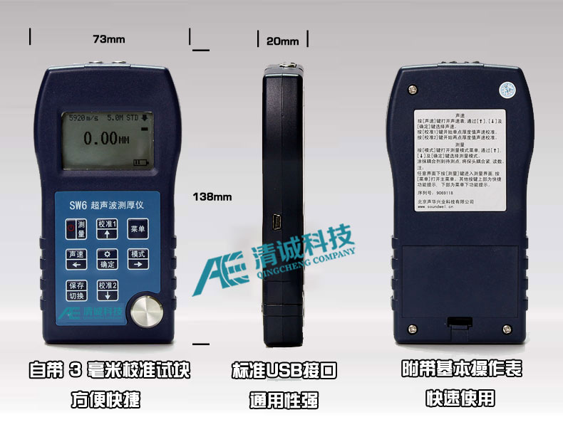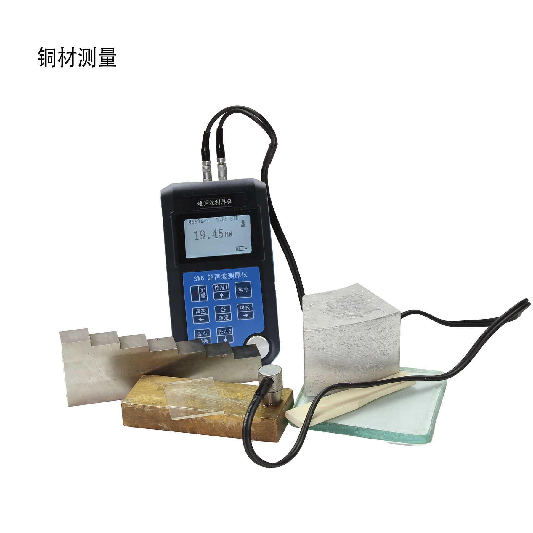 SW6高精度超声波测厚仪,适用于各种材料的高精度厚度测量需求,可应用于钢、铸铁、铝、铜、锌、石英、玻璃、聚乙烯、PVC,灰口铸铁、球墨铸铁等材质的被测物体厚度测量。只需要将探头放置于被测物体一侧的接触面上,既可以迅速准确测量出被测物体厚度。