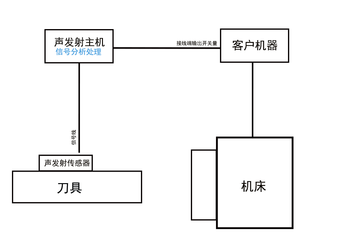 原理:机床偶发故障导致撞刀产生声发射(声波)信号,声发射传感器接收声发射(声波)信号,经过信号线传输给声发射主机进行分析处理,声发射主机在1ms内发出碰撞信号到用户的机器控制机床紧急停机。
